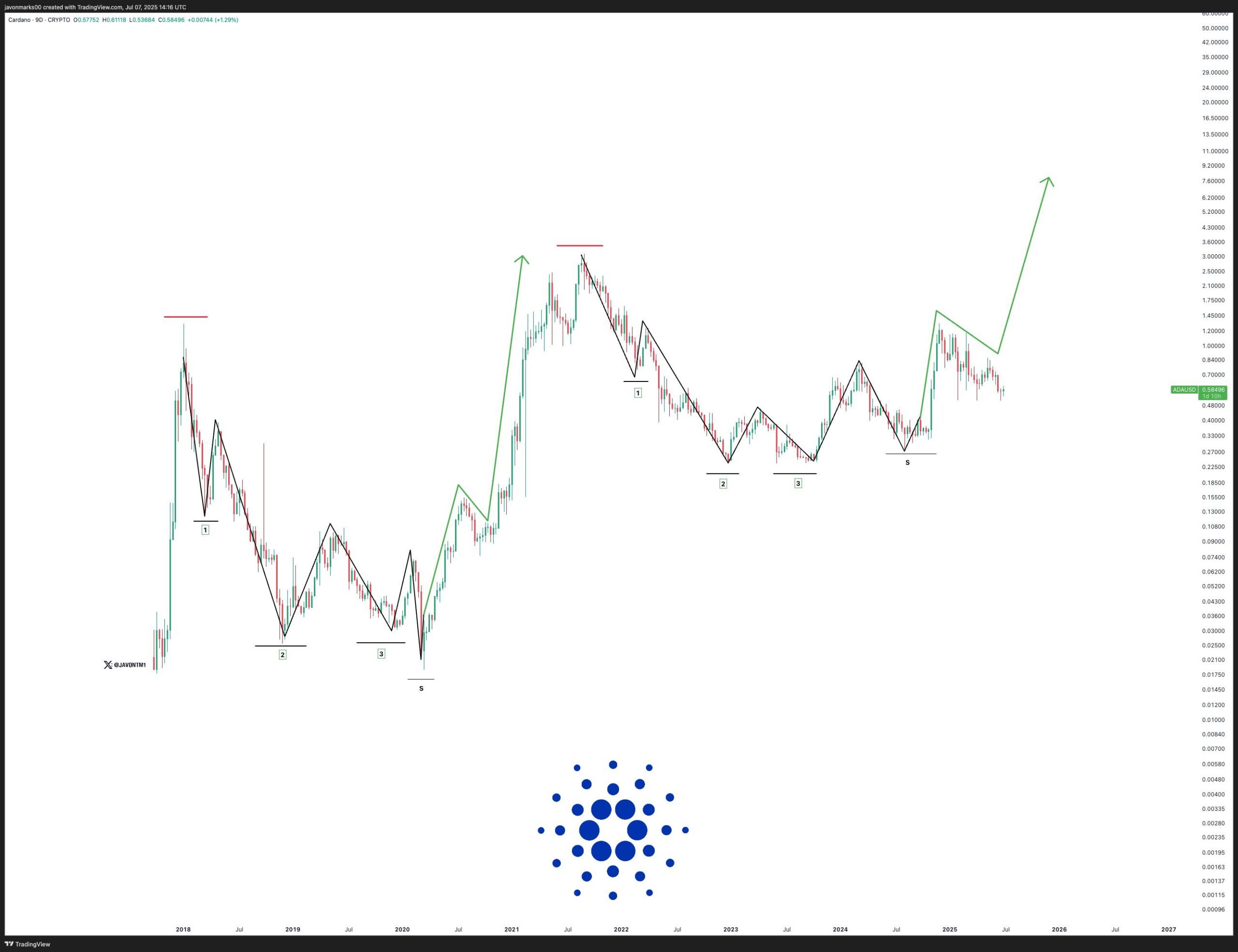 Dalam sebuah postingan di X pada 7 Juli, analis kripto Javon Marks mencatat bahwa pergerakan harga ADA sekarang mencerminkan struktur fase akumulasi besar terakhirnya, yang mendahului reli eksplosifnya pada 2021.