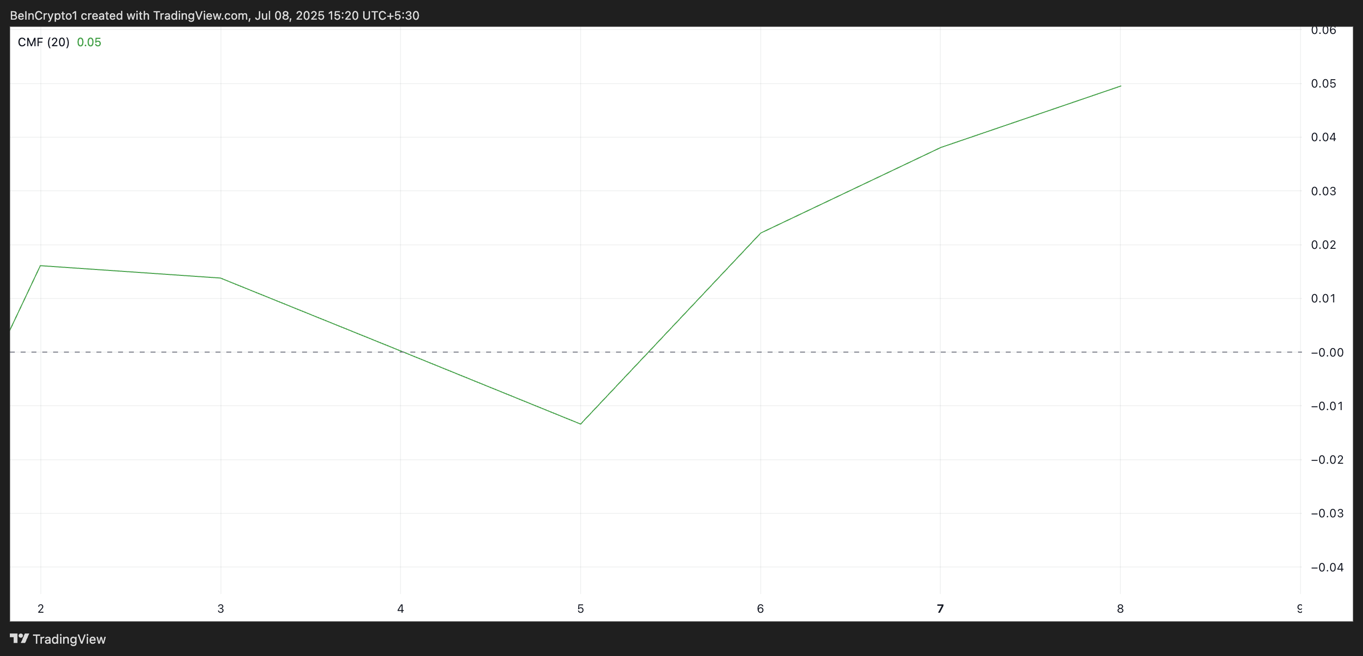 Selain itu, meskipun harganya stagnan, Chaikin Money Flow (CMF) ADA telah naik, menunjukkan peningkatan tekanan beli yang stabil. Pada waktu publikasi, indikator momentum ini, yang melacak bagaimana uang mengalir masuk dan keluar dari aset, berada di 0,05 dan dalam tren naik.