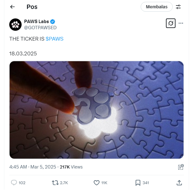 Proyek kripto yang lahir dari mini-app Telegram, PAWS akhirnya secara resmi mengumumkan tanggal token generation event (TGE) dan juga listing koin. Melalui utas X (Twitter), pengembang PAWS mengatakan bahwa pihaknya akan menggelar aksi tersebut pada 18 Maret 2025.