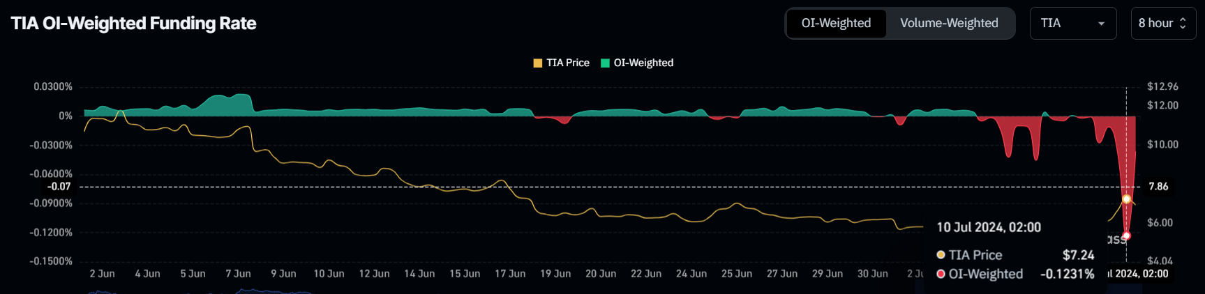 Adapun kenaikan OI yang pesat umumnya menyoroti meningkatnya minat serta kepercayaan di kalangan trader dan investor. Hanya saja, hal ini tidak terjadi dengan Celestia. Trader TIA justru mendambakan penurunan harga. Dan kondisi ini terpampang pada arah funding rate.