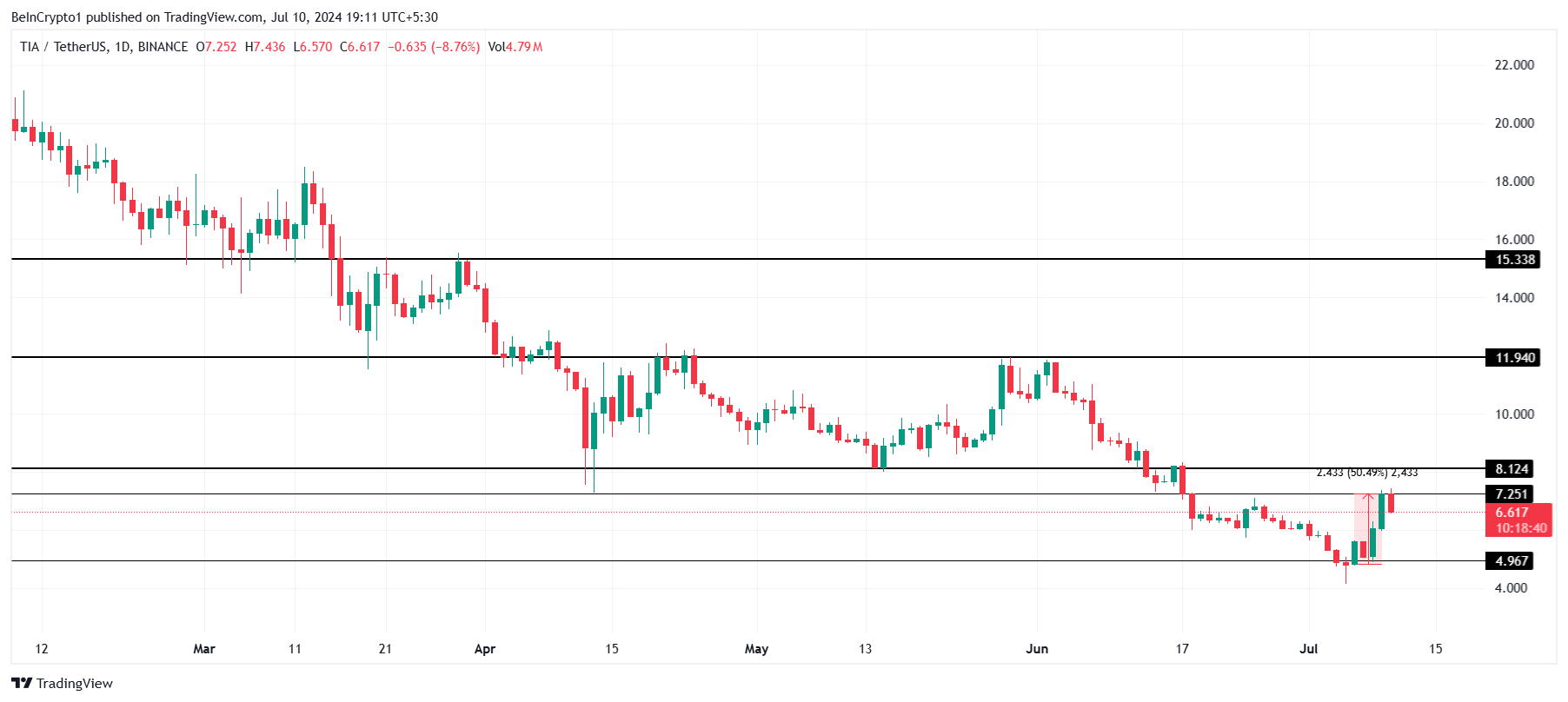 Harga Celestia (TIA) memiliki potensi untuk bergerak ke dua arah yang berlawanan. Salah satunya sesuai permintaan investor, dan yang kedua adalah yang disarankan pasar. Jika TIA mengikuti permintaan investor, maka harganya bisa berakhir dengan kehilangan profit yang berhasil diraup baru-baru ini sekaligus amblas menuju US$4,9.