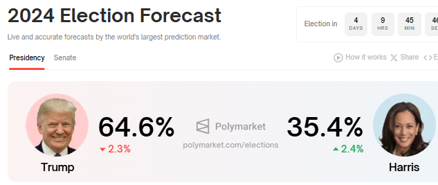 Sementara itu, warga Amerika terus menghitung hari menjelang 5 November, tanggal pemilihan AS. Berdasarkan data Polymarket, Donald Trump saat ini memimpin dengan 64,6% empat hari sebelum pemilihan.