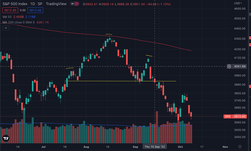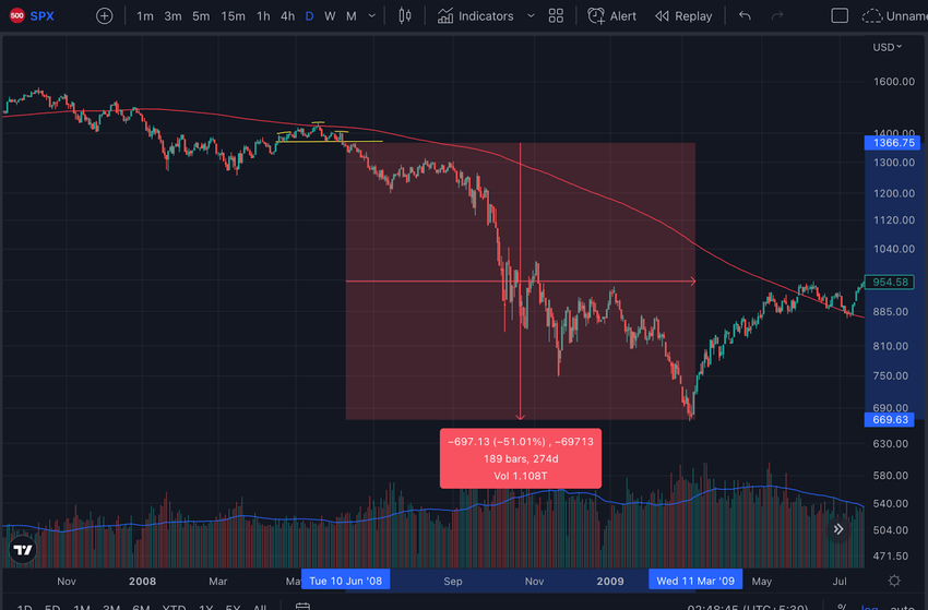 Apakah ada kesamaan antara grafik indeks S&P 500 di tahun 2008 dengan grafiknya di tahun 2022? Pada tahun 2008, ketika indeks turun hampir 10% dari titik tertinggi sepanjang masa (ATH), indeks tersebut kembali menguji pola Simple Moving Average (SMA) 200 hari. Di samping itu, terdapat juga formasi tipe head-and-shoulder, serta indeks yang telah menembus neckline pada bulan Juni 2008 silam.