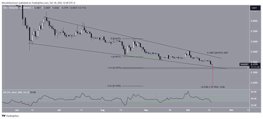 Karena harga SUI sekarang berada di titik terendahnya sepanjang masa, penggunaan alat Fibonacci retracement diperlukan untuk menentukan area potensial untuk titik bottom. Sebagai catatan, level Fibonacci eksternal 1,61 dari kenaikan sebelumnya berada di US$0,34. Lalu, karena ini bertepatan dengan garis support wedge, ini adalah level yang cocok untuk titik bottom.