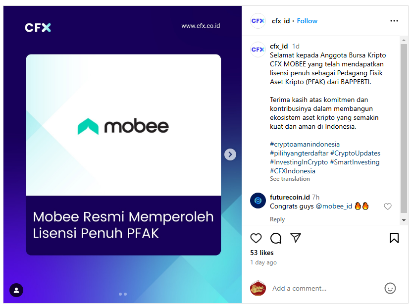 “Selamat kepada Anggota Bursa Kripto CFX, Mobee yang telah mendapatkan lisensi penuh PFAK dari Bappebti,” jelas CFX.
