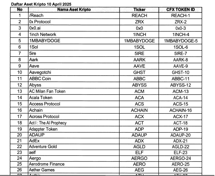 PT Central Finansial X (CFX) selaku satu-satunya bursa kripto teregulasi di Indonesia belum lama ini merilis daftar aset kripto yang bisa diperdagangkan secara sah di platform perdagangan aset keuangan digital Indonesia. Daftar tersebut memuat 1.374 token sebagai acuan bagi penyelenggara perdagangan aset kripto. SK tersebut sudah mulai berlaku sejak 10 April 2025 kemarin.