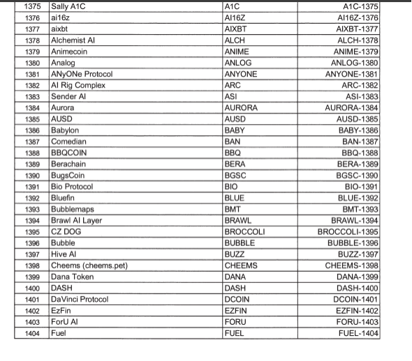 Selain itu juga masuk Aurora, AUSD, Babylon, Comedia, BBQCOIN, Berachain, BugsCoin, Bio Protocol, Bluefin, Bubblemaps, Brawl AI Layer dan juga CZ DOG.