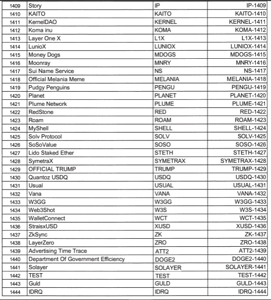 Beberapa token yang masuk dalam pembaruan daftar aset kripto yang sah diperdagangkan adalah Sally A1C (A1C), ai16z (AI16Z), aixbt (AIXBT), Alchemist AI (ALCH), Animecoin (ANIME), Analog (ANLOG), ANyONe Protocol (ANYONE), AI Rig Complex (ARC) serta Sender AI (ASI).