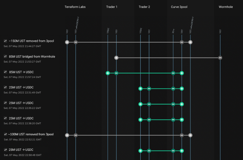Berdasarkan para pakar, kejadiannya dimulai tanggal 7 Mei malam hari, ketika Terraform Labs menarik 150 juta UST dari liquidity pool 3pool di Curve; yang mana hal tersebut merupakan bagian dari operasi terencana. Operasi yang besar dan unik seperti itu, menurut para analis, meningkatkan volatilitas pool.