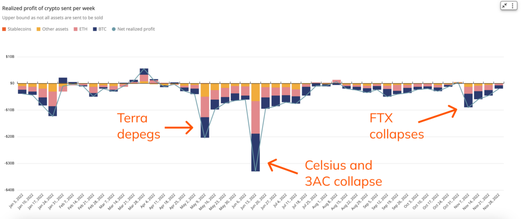 Chainalysis menghitung keuntungan dan kerugian yang direalisasikan di setiap minggu. Namun, perlu diingat, data yang mereka kumpulkan tidak memperhitungkan semuanya.