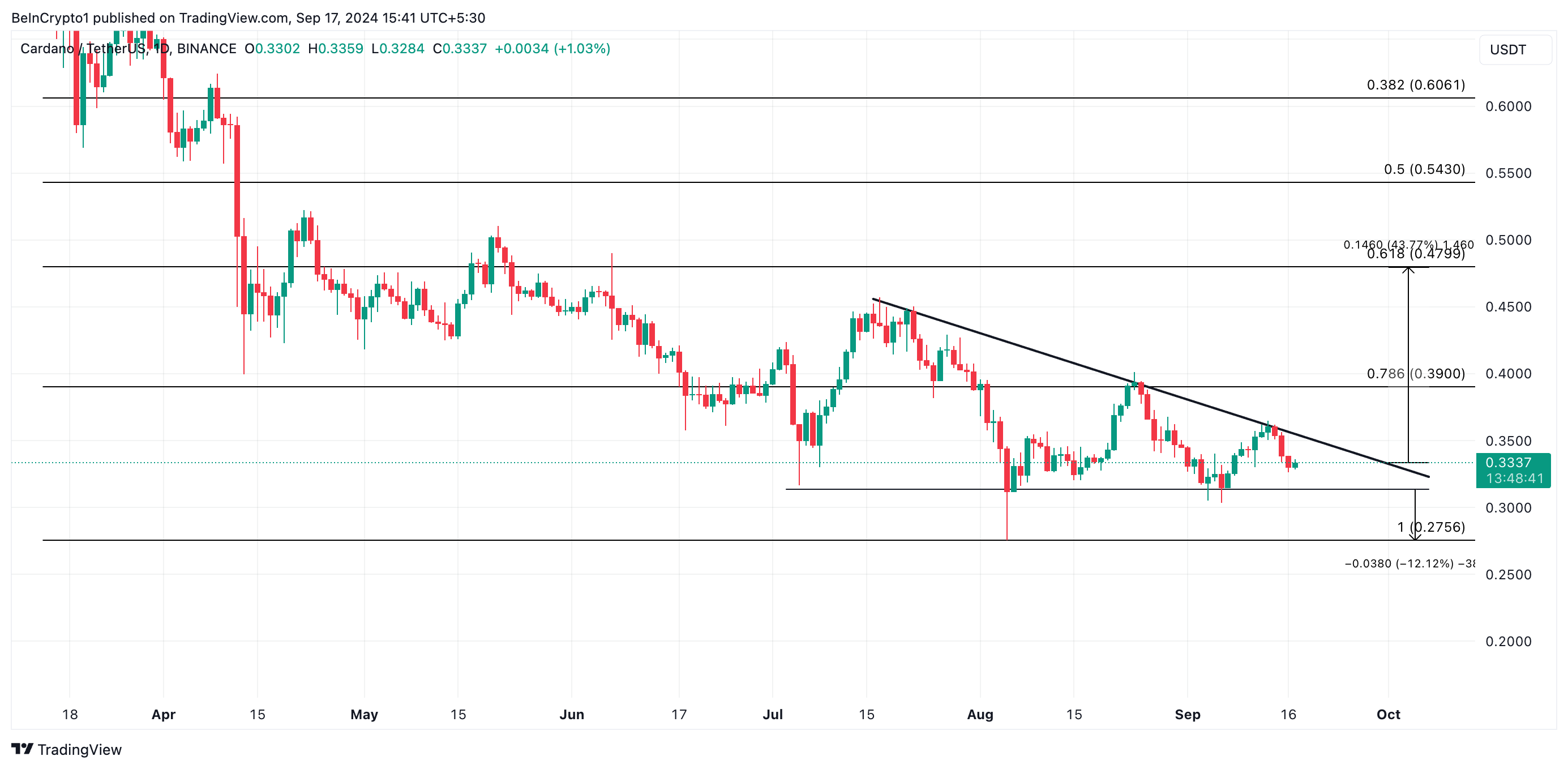 Analisis BeinCrypoto dari pergerakan harga Cardano pada grafik satu hari menunjukkan bahwa altcoin ini telah diperdagangkan dalam segitiga menurun sejak 15 Juli. Pola bearish ini muncul ketika harga aset membentuk serangkaian puncak yang lebih rendah dan level dukungan horizontal.