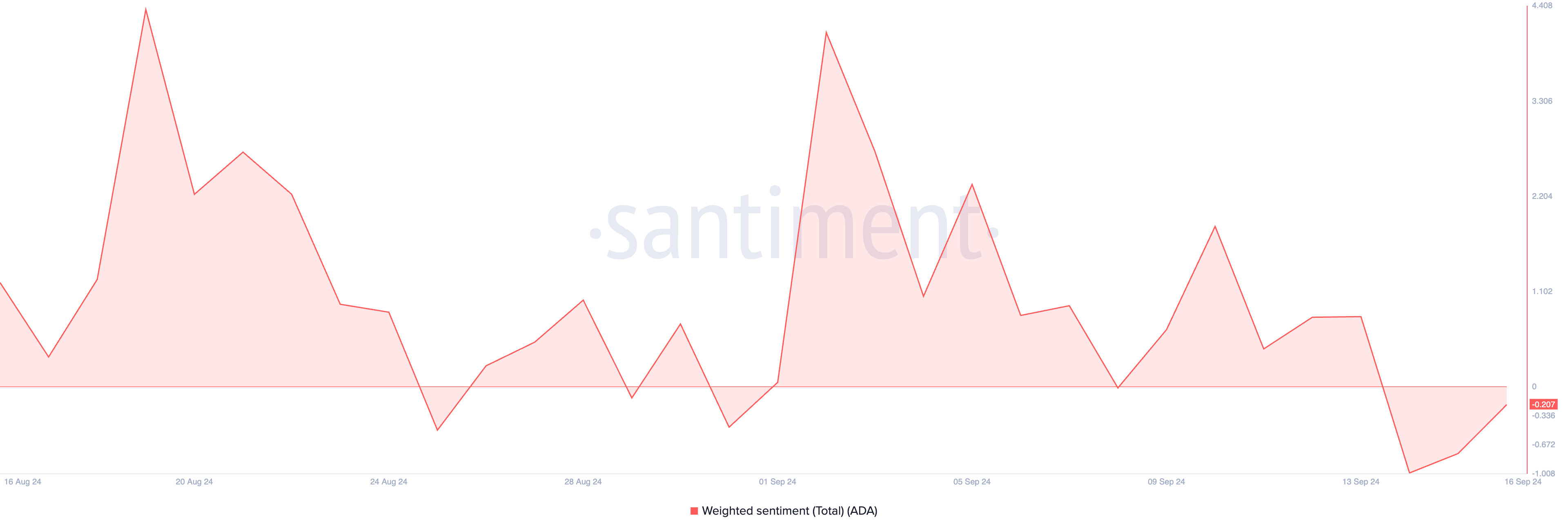 Penurunan permintaan ADA selama minggu lalu dapat diatributkan pada pergeseran sentimen secara bertahap dari positif menjadi negatif, seperti yang tercermin dari sentimen berbobotnya. Sentimen berbobot ADA, yang mengukur suasana pasar, adalah -0,20 saat ini.