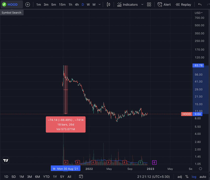 Kondisi pasar global secara keseluruhan dan juga terjangan crypto winter sangat berdampak pada harga saham Robinhood (HOOD). Harga saham mereka bahkan tercatat anjlok sedalam 88% dari level tertingginya sepanjang masanya (ATH) pada Agustus 2021 lalu.