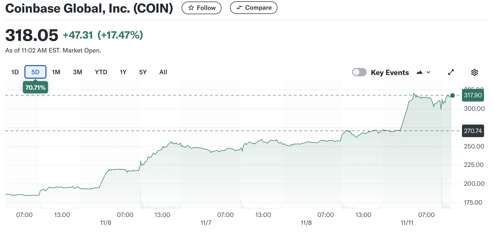 Coinbase mengalami lonjakan dramatis segera setelah perdagangan dimulai pada Senin pagi, dan terus meningkat. Pada waktu publikasi, nilai saham perusahaan hampir mencapai US$320 per saham, level tertinggi sejak ATH-nya pada November 2021. Binance, exchange aset kripto terkemuka lainnya, juga melonjak sejak pemilihan Trump, namun reli ini kurang langsung terlihat.