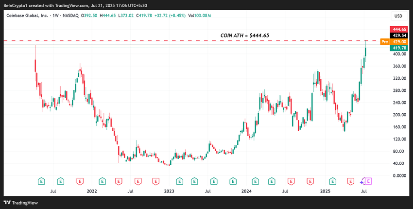 Setelah menunggu lebih dari empat tahun, para investor IPO Coinbase yang lama menderita akhirnya kembali untung. Pada 18 Juli, harga COIN naik ke all-time high (ATH) sebesar US$444,65, sebelum mengalami koreksi cepat. Pada waktu publikasi, saham Coinbase diperdagangkan seharga US$428,75 di pre-market.