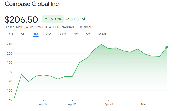 Sementara itu, harga saham Coinbase telah pulih secara signifikan sejak tarif besar-besaran Trump bulan lalu. COIN melonjak lebih dari 36% sejak April, saat exchange ini mempersiapkan laporan pendapatan Q1 2025 yang akan dirilis hari ini.
