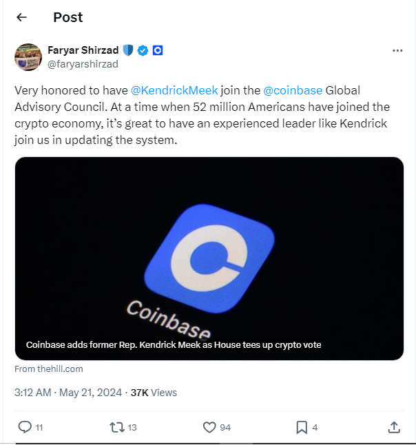 Chief Policy Officer (CPO) Coinbase, Faryar Shirzad melalui utas X (sebelumnya Twitter) menjelaskan, masuknya Meek akan sangat membantu dalam menavigasi lanskap kripto. Pasalnya saat ini, sebanyak 52 juta orang di Amerika telah bergabung dalam ekonomi kripto.