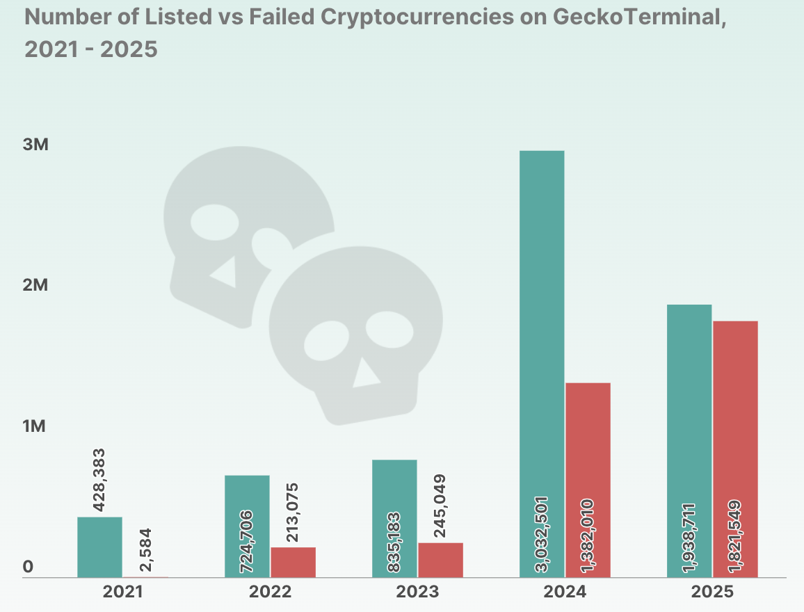 CoinGecko juga membongkar fakta mengkhawatirkan lainnya: menurut perhitungannya, sebagian besar proyek kripto yang aktif sejak 2021 kini telah mati. Laporan ini menyebutkan 52,7% dari semua token tersebut telah gagal, dan tingkat kegagalannya terus menanjak.