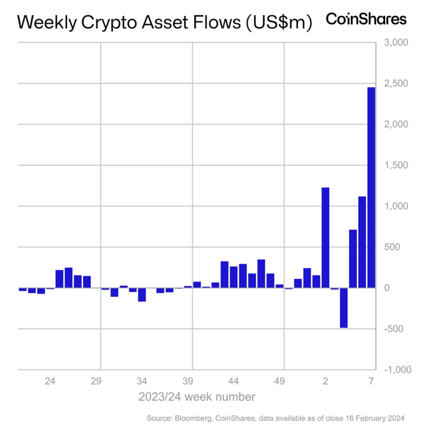 Laporan terbaru dari CoinShares Research mengungkapkan bahwa exchange-traded fund (ETF) Bitcoin spot mencatatkan arus masuk sebesar US$2,4 miliar dalam seminggu terakhir. Sementara itu, mereka hanya membukukan arus keluar sebesar US$167 juta. Adapun rekor arus masuk ini kembali ke level seperti pada Desember 2021.