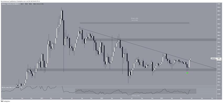 Analisis time frame mingguan untuk XMR sendiri menunjukkan bahwa harganya telah meningkat secara signifikan sejak memantul di area support horizontal US$130 (ikon hijau) selama sepekan, tepatnya dari tanggal 5 hingga 12 Juni.