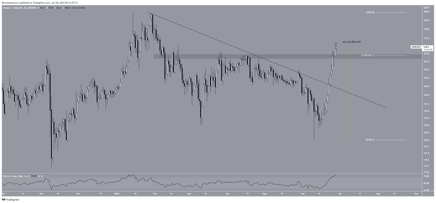 Hal ini juga didukung oleh harga XMR yang bergerak di atas level resistance Fibonacci retracement 0.618 di US$164.