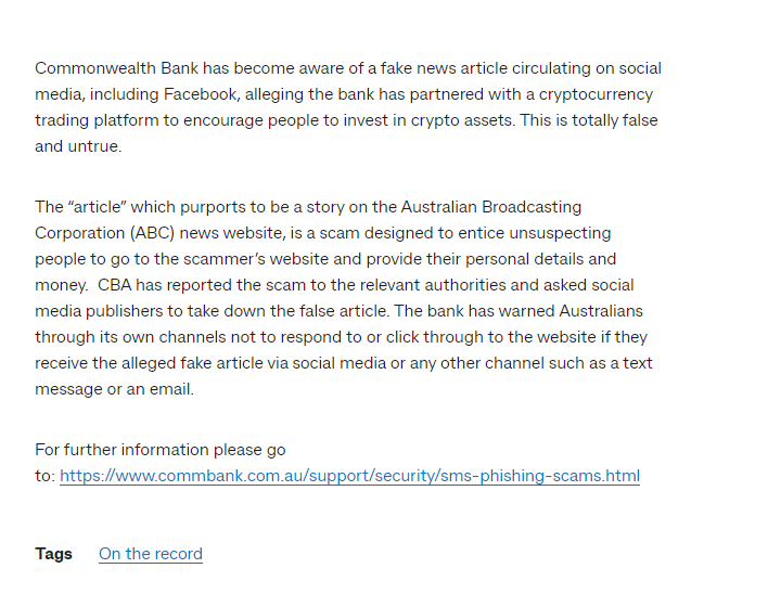 Salah satu bank terbesar di Australia, Commonwealth Bank of Australia (CBA), membantah isu yang mengatakan bahwa perusahaan telah mengikat kerjasama dengan salah satu platform kripto. Hal itu dikemukakan lantaran adanya berita palsu yang mengatakan bahwa CBA telah bermitra dengan perusahaan kripto untuk mendorong arus investasi disana.