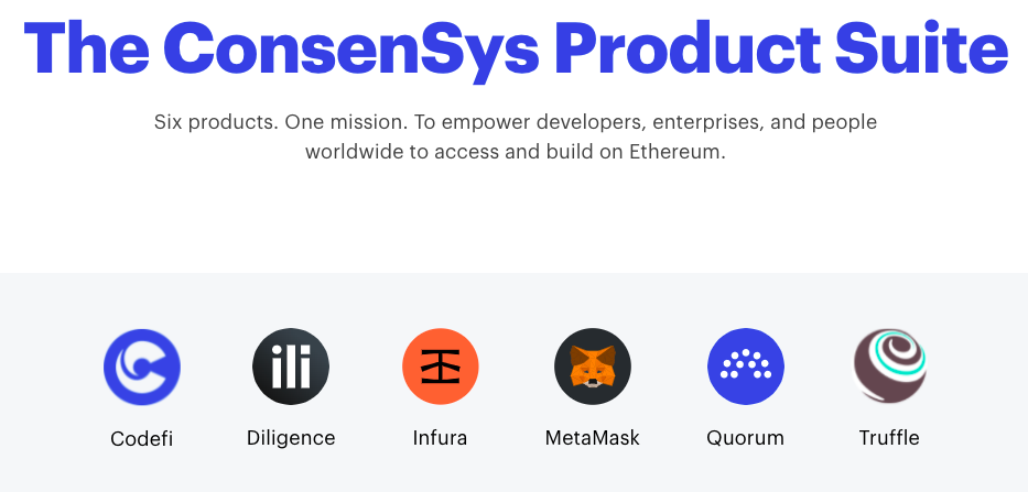 Adapun rangkaian produk mereka terdiri dari Infura, Quorum, Codefi, MetaMask, Truffle, Diligence, serta platform NFT mereka.