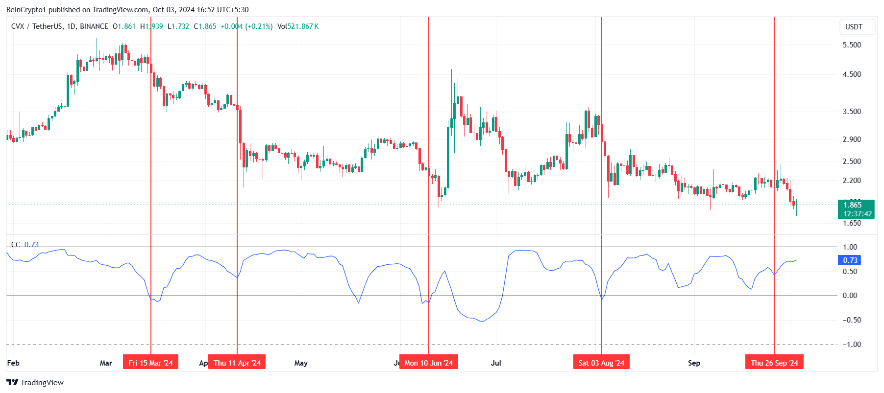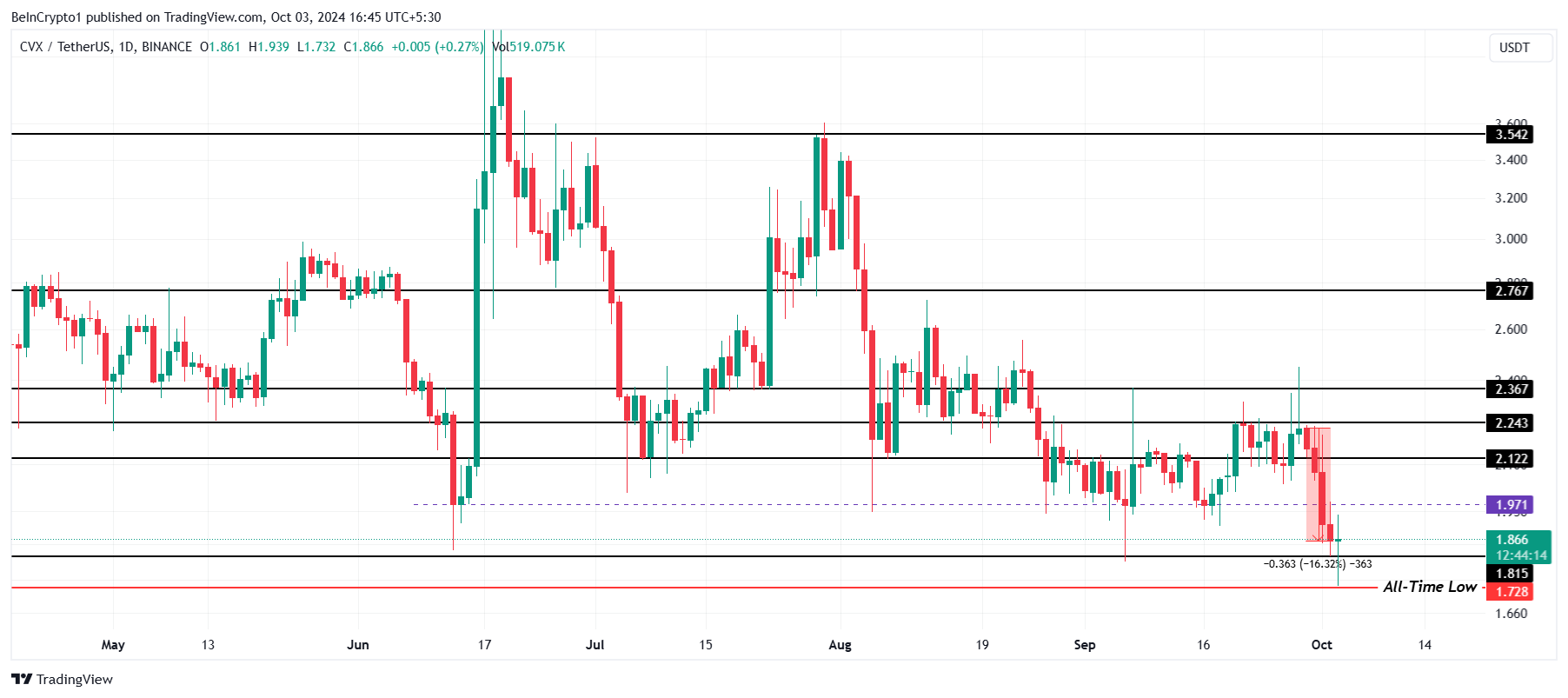 Dalam empat hari terakhir, CVX telah mengalami penurunan 16%, menciptakan tekanan bearish yang intens. Ini mengakibatkan token mencapai titik terendah baru sepanjang masa, dengan penurunan intra-hari sebesar 6%, membawa CVX turun menjadi US$1,72. Saat ini, CVX diperdagangkan sedikit lebih tinggi di US$1,86, tepat di atas level dukungan kritis US$1,81.