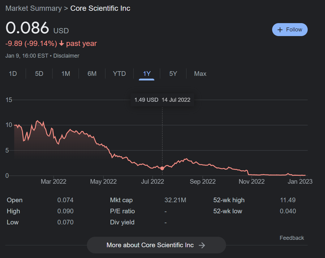 Laporan Culper Research menunjukkan bahwa orang dalam di Core Scientific telah meninggalkan kepura-puraan peduli mereka terhadap pemegang saham mayoritas. Pada 3 Maret 2022, harga saham perusahaan mining crypto yang diperdagangkan di Nasdaq dengan kode CORZQ itu turun 9,4%.