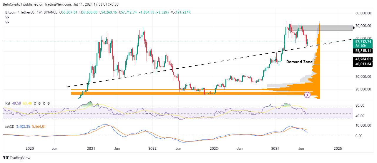 Sebaliknya, posisi MACD di bawah garis sinyalnya menunjukkan potensi momentum bearish dalam aksi harga BTC. Dalam bias arah ke selatan, terobosan serta penutupan di bawah garis tren naik pada time frame mingguan bisa membuat BTC menyuguhkan peluang beli ideal lainnya di dalam zona permintaan di kisaran US$43.964 – US$40.013.