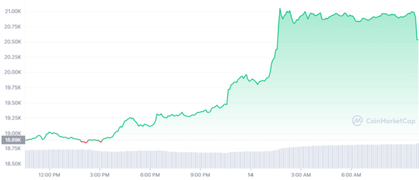 Dalam kurun 14 hari terakhir, harga Bitcoin (BTC) mengalami kenaikan 25,9%. Sementara itu, bila kita ukur dalam rentang waktu 24 jam terakhir, aset kripto dengan kapitalisasi pasar terbesar itu sudah menguat 11%, hingga melampaui level US$20.000. Bitcoin bahkan terpantau sempat diperdagangkan sedikit di atas kisaran US$21.000 pada awal jam perdagangan hari ini (14/1).