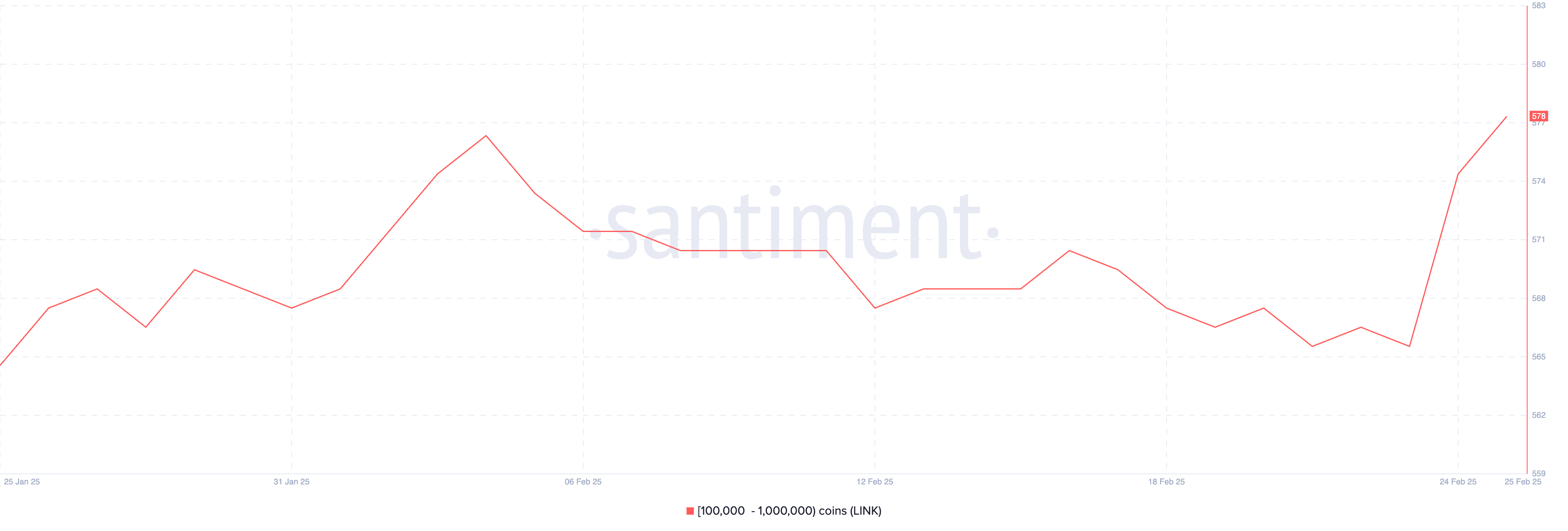 Walau tren turun masih mendominasi, tanda-tanda potensi pemulihan mulai terlihat. Jumlah crypto whale LINK – yakni alamat yang memegang antara 100.000 hingga 1.000.000 LINK – sempat menyusut dari 577 pada 4 Februari menjadi 566 pada 23 Februari. Namun, pembalikan signifikan terjadi pada 25 Februari saat jumlah ini melonjak ke 578 seiring dengan aksi beli oleh crypto whale.