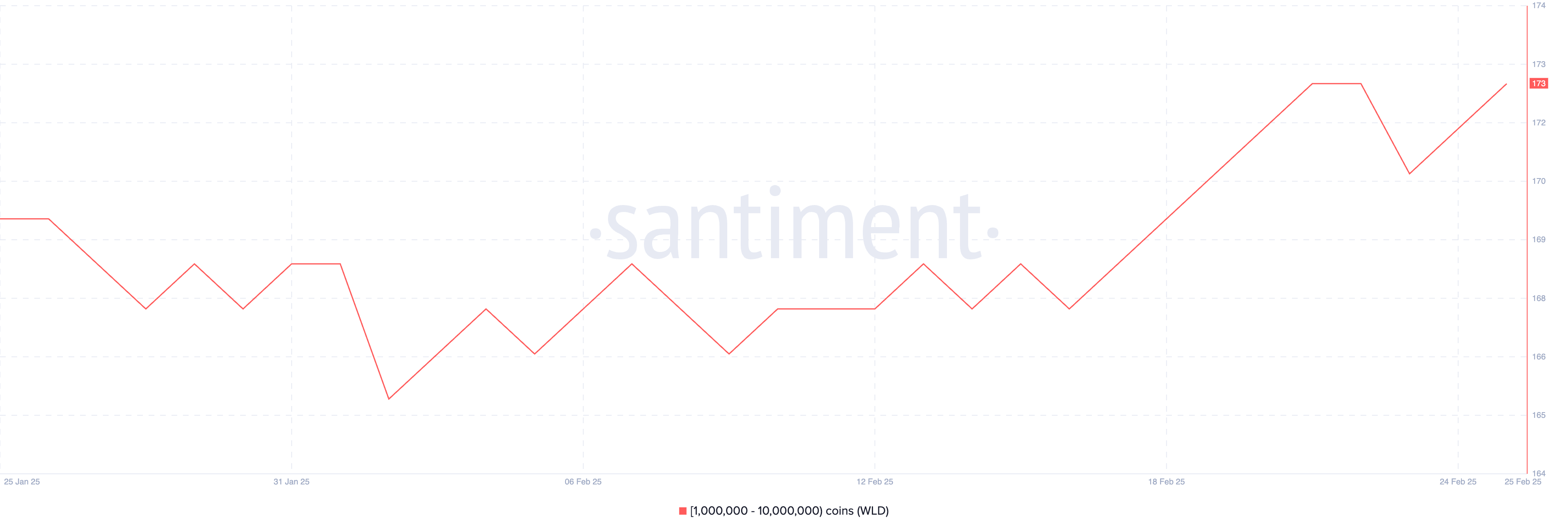 Jumlah alamat yang memegang antara 1.000.000 hingga 10.000.000 WLD kini terangkat menjadi 173 – mencapai level tertinggi sejak 29 Desember 2024.