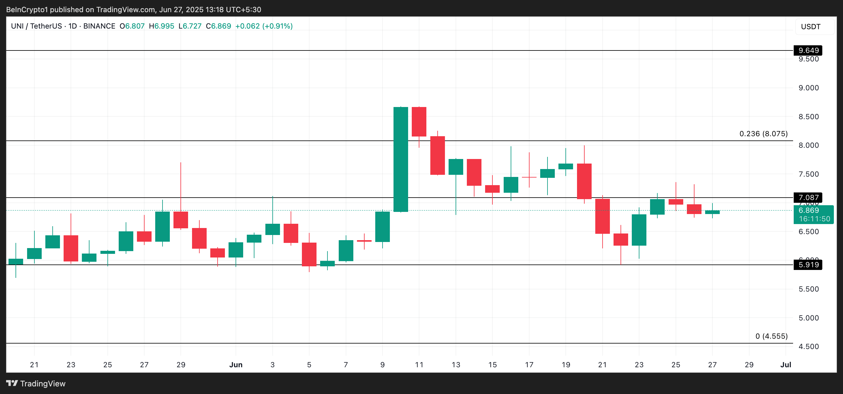 Selain itu, lonjakan arus masuk bersih holder besar bisa memicu trader ritel ikut-ikutan menambah akumulasi UNI. Seumpama tekanan beli terus membara, altcoin ini berpotensi menembus zona harga US$7.