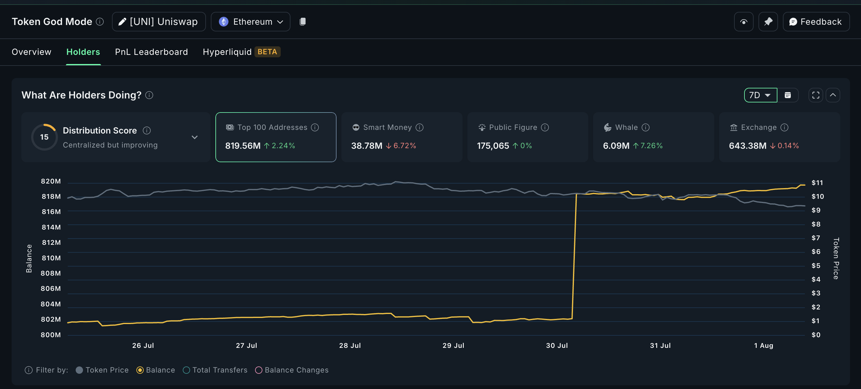 Sebagai decentralized exchange (DEX) nomor wahid, Uniswap berada di posisi strategis untuk menjadi motor penggerak perdagangan on-chain teregulasi. Selama sepekan terakhir, crypto whale menggenjot kepemilikan UNI sebesar 7,26%, meskipun harga turun 6,7% di periode yang sama.