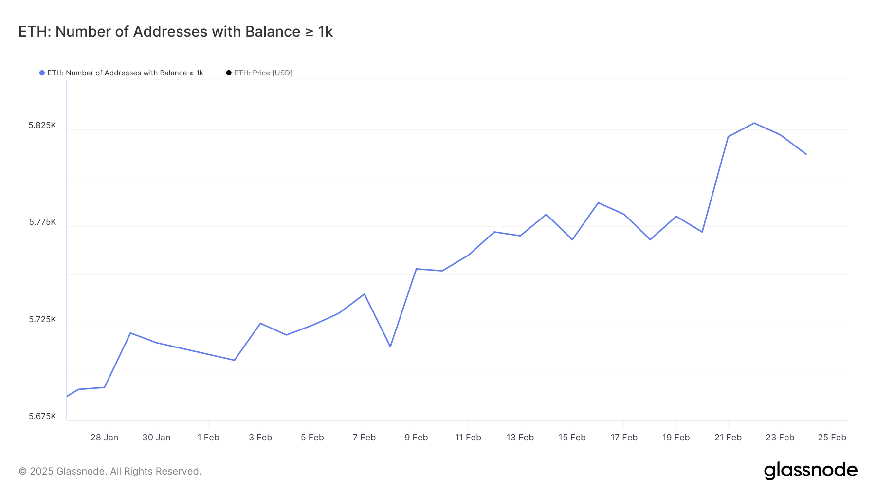 Jumlah whale ETH — alamat wallet yang menyimpan setidaknya 1.000 ETH — meningkat secara bertahap sepanjang bulan lalu, mencapai puncaknya di angka 5.828 pada 22 Februari, yang merupakan level tertinggi sejak Februari 2024. Namun, tren ini mulai berbalik dengan sedikit penurunan menjadi 5.812.