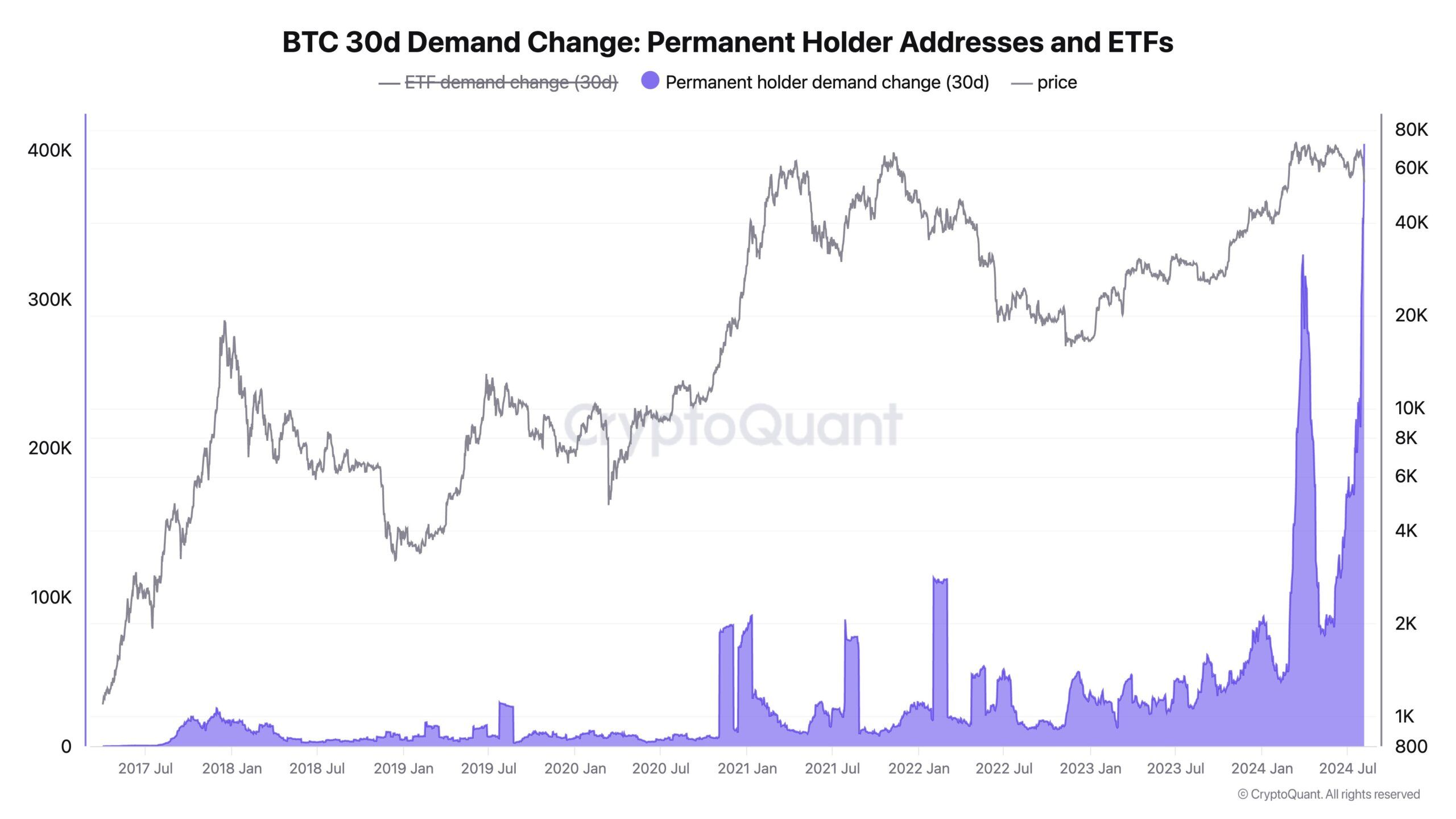 Data on-chain dari CryptoQuant mengungkap, lebih dari 404.000 Bitcoin telah berpindah ke alamat holder permanen dalam 30 hari terakhir. Ki Young Ju, CEO CryptoQuant, menyatakan bahwa ini “jelas akumulasi”. Ki juga menggarisbawahi arus masuk yang deras sebesar 40.000 Bitcoin ke sejumlah produk exchange-traded fund (ETF) spot AS selama 30 hari terakhir.