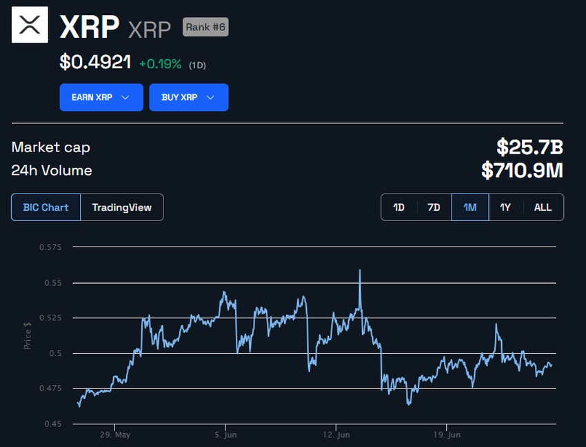 Berdasarkan data dari BeInCrypto, XRP sekarang diperdagangkan seharga US$0,4917 setelah naik 0,08% dalam 24 jam terakhir. Aset kripto ini terus menikmati performa harga yang semakin membaik sejak Komisi Sekuritas dan Bursa AS merilis dokumen kontroversial yang terkait dengan mantan pejabatnya, William Hinman.