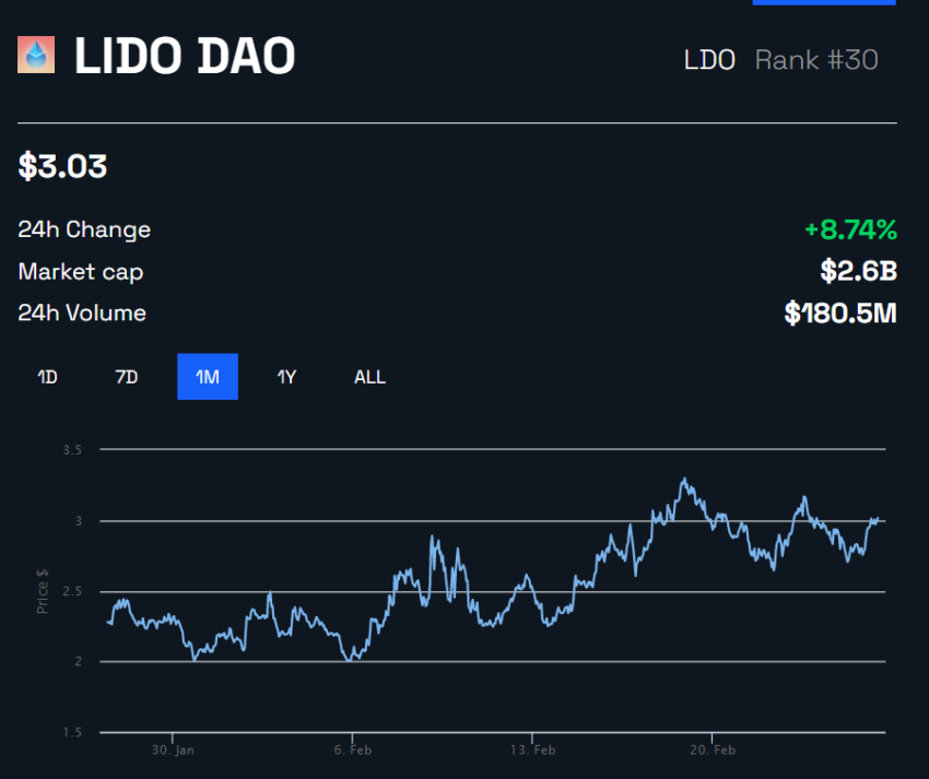 Sementara itu, menurut data dari BeInCrypto terlihat bahwa peningkatan aktivitas yang ada menyebabkan token milik Lido, yaitu Lido DAO (LDO), mengalami kenaikan sekitar 9% menjadi US$3,03 dalam 24 jam terakhir.