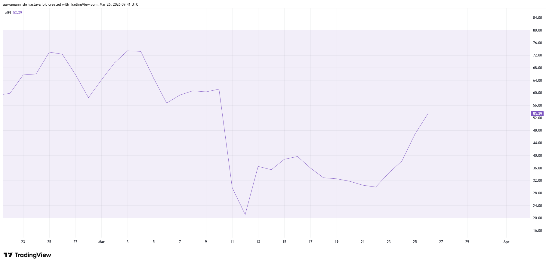 Money Flow Index (MFI) di grafik harian menunjukkan angka 53,39 per 26 Maret. Setelah jatuh dari atas 72 di akhir Februari ke titik terendah di angka 24 sekitar pertengahan Maret, MFI terus pulih secara stabil dalam dua minggu terakhir. Angka 53,39 ini berada di area netral dan masih naik, sehingga mendukung kemungkinan kenaikan harga jangka pendek — yang merupakan bagian handle dari pola inverted cup and handle tersebut.