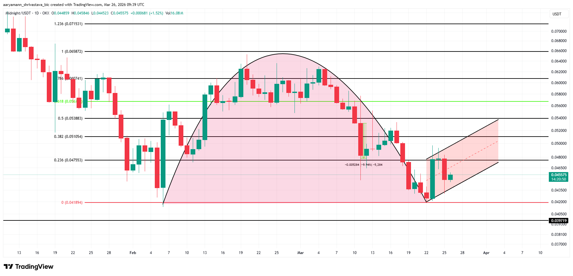 Midnight (NIGHT) saat ini diperdagangkan di harga US$0,0455, naik 1,52% dalam sehari setelah pulih dari harga terendah US$0,043 di awal pekan ini. Kemitraan bank Monument dengan Midnight Foundation menjadi pencapaian institusi besar bagi proyek ini.
