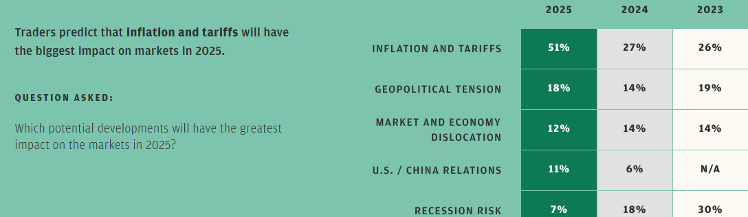Dalam konteks ini, survei tahunan yang melibatkan klien perdagangan institusional dari JPMorgan Chase mengungkapkan bahwa 51% trader percaya inflasi dan tarif akan menjadi faktor paling berpengaruh di pasar global pada 2025.