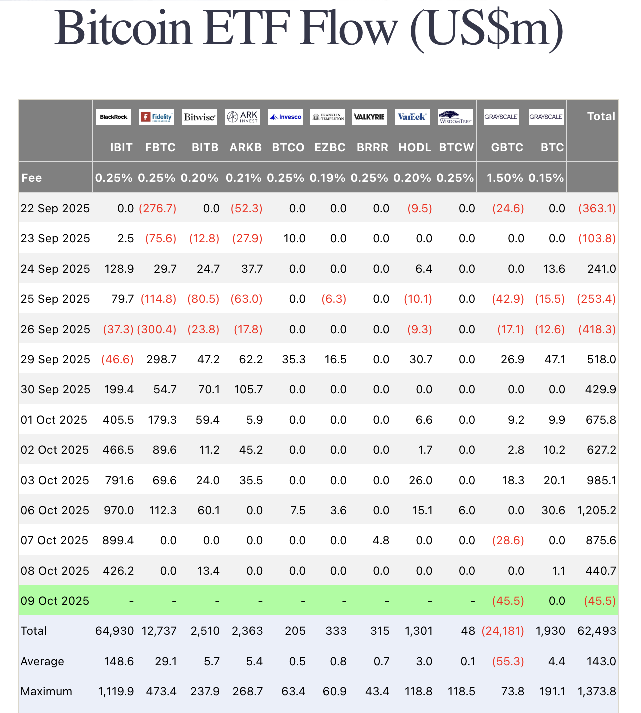 Spot Bitcoin ETF di AS mempertahankan momentum pada 8 Oktober, mencatat hari lain dengan arus masuk bersih yang signifikan setelah aktivitas akhir pekan yang kuat. Menurut Farside Investors, total arus masuk bersih untuk semua dana mencapai US$440,7 juta hari itu, terutama didorong oleh iShares Bitcoin Trust (IBIT) milik BlackRock, yang menarik US$426,2 juta. Dana Ark/21Shares ARKB juga melihat arus masuk sebesar US$13,4 juta. Untuk minggu yang dimulai pada 7 Oktober, arus masuk sudah mendekati US$1,3 miliar, menyoroti permintaan investor yang terus-menerus untuk eksposur Bitcoin.