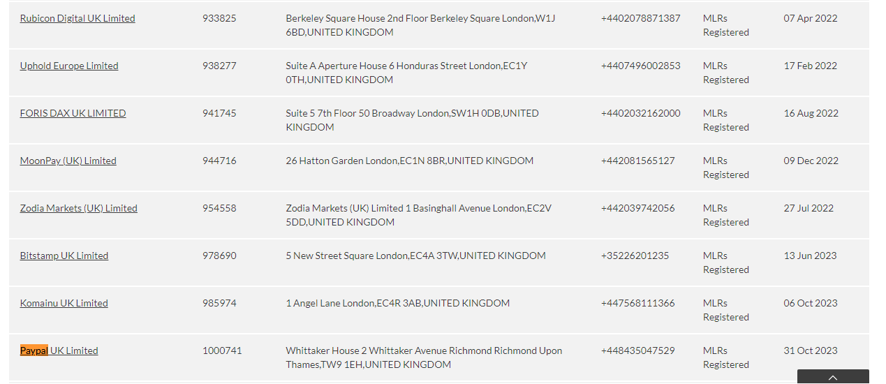 Di laman FCA, terlihat bahwa PayPal sudah berhasil mendapatkan lisensi Anti-Pencucian Uang, Pendanaan Teroris, dan Pengiriman Dana (MLRs).