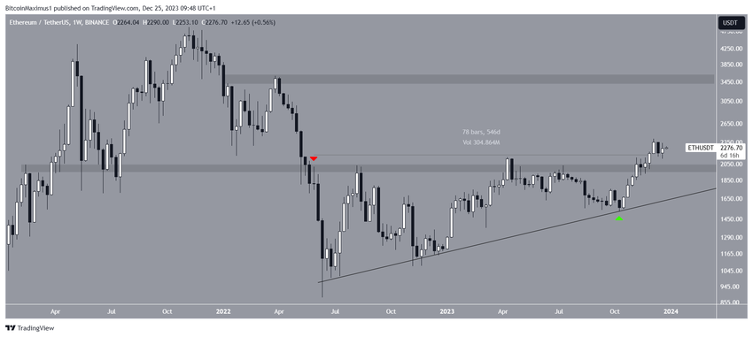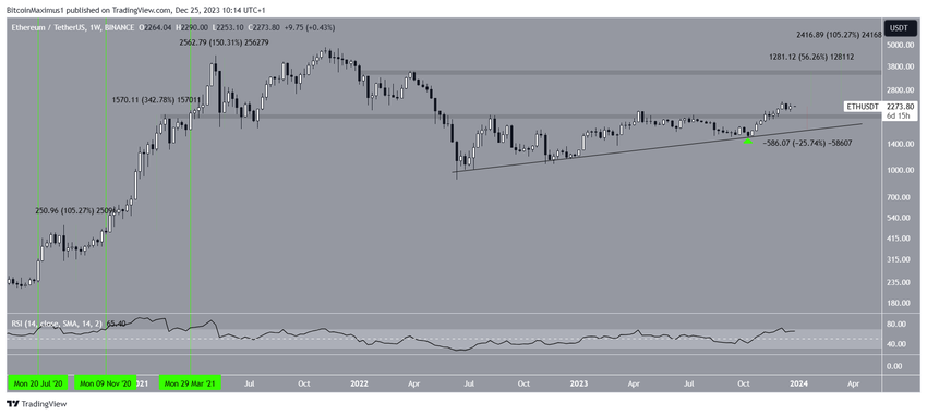 Laju reli ini semakin cepat usai terjadinya pemantulan tersebut, yang menyebabkan tercapainya puncak tahunan baru di angka US$2.403 pada 8 Desember. Di samping itu, kenaikan ETH ini juga penting karena menyebabkan terjadinya breakout harga dari area resistance horizontal 550 hari.