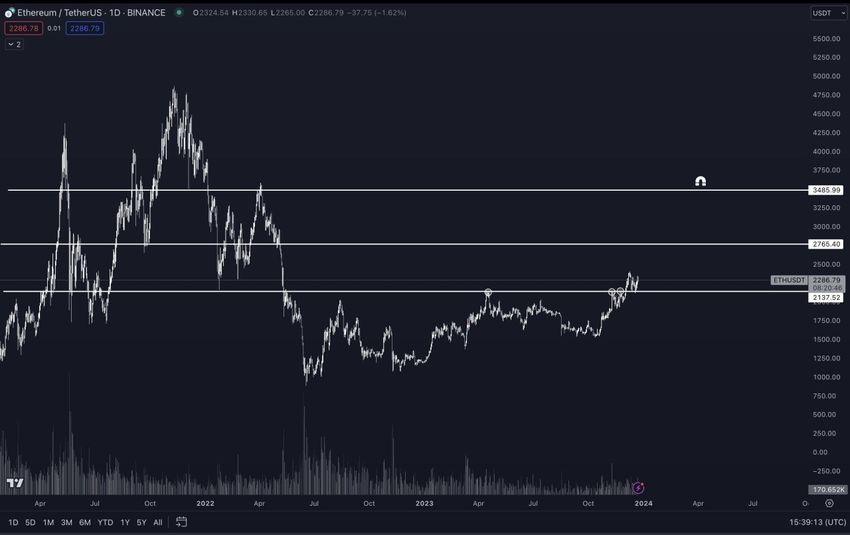 Dalam pergerakan saat ini, area resistance terdekat di US$3.400 adalah 55% di atas harga Ethereum saat ini, sementara rekor harga tertinggi (ATH) ETH adalah 105% di atasnya.