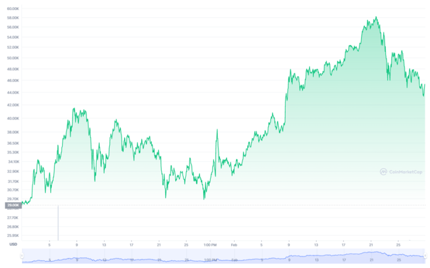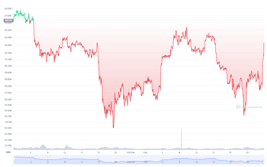 Kondisi tersebut tentunya berdampak signifikan pada harga Bitcoin. Pada tanggal 1 Januari 2022, harga BTC sebesar US$46.311,74. Ada penurunan besar di hari-hari berikutnya, terlebih lagi setelah adanya sentimen negatif di pasar kripto akibat invasi Rusia terhadap Ukraina di akhir bulan Februari. Alhasil, harga BTC pun menurun 6% dari harga saat di awal tahun. Pada tanggal 28 Februari 2022, BTC dihargai senilai US$43.193,23.