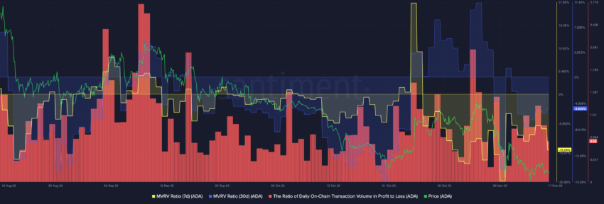 Alasan di balik perpindahan koin tersebut adalah bisa jadi karena Supply in Loss ADA yang jumlahnya telah meningkat pesat dalam jangka panjang. Volume on-chain hariannya juga secara konsisten mengalami kerugian dalam jumlah besar. Namun, apabila kita bandingkan dengan performanya di bulan September, masih ada serangkaian aksi kenaikan yang terjadi.