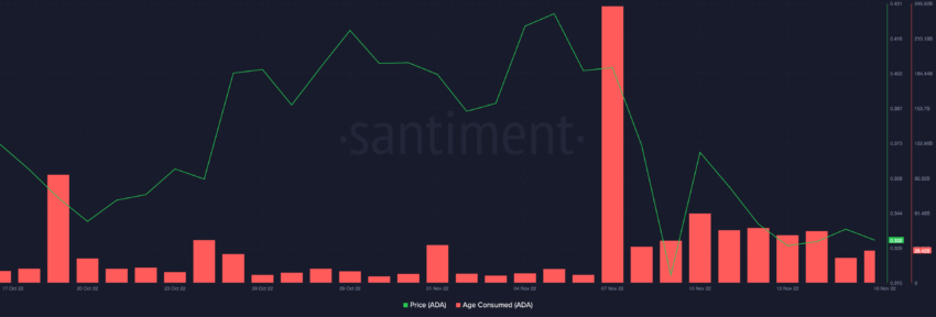 Sementara itu, aksi harga bearish yang diikuti oleh Cardano tampaknya juga telah memicu sejumlah koin lama kembali aktif beredar. Kondisi ini terlihat dari metrik Age Consumed untuk ADA yang menunjukkan bahwa setelah badai yang menghantam pada 7 November lalu, sejumlah besar koin lama telah secara aktif berpindah.