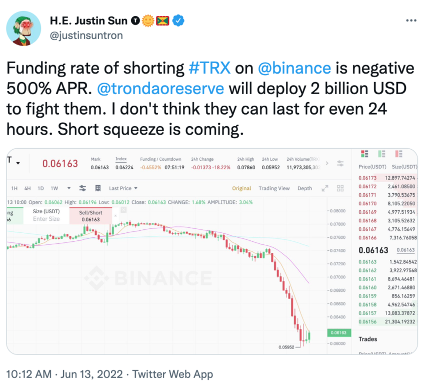Justin Sun mengklaim dalam tweet hari Senin (13/6) bahwa cadangan TRON DAO akan dikerahkan sebanyak US$2 miliar untuk melawan para trader yang melakukan aksi shorting di tengah harga TRX yang sedang anjlok. Menurut Sun, upaya ini akan menghalangi para trader yang ingin melakukan aksi short terhadap TRX